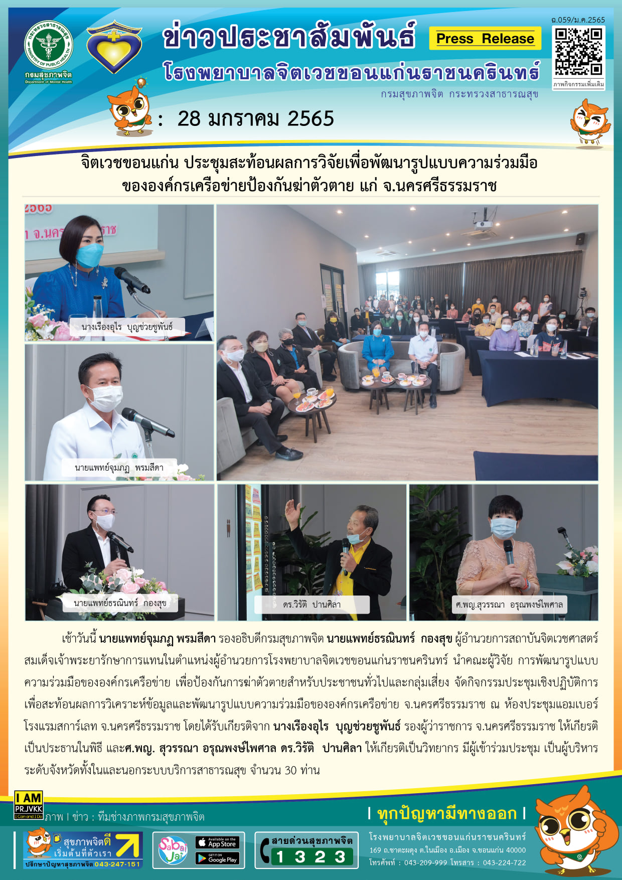จิตเวชขอนแก่น ประชุมสะท้อนผลการวิจัยเพื่อพัฒนารูปแบบความร่วมมือขององค์กรเครือข่ายป้องการการฆ่าตัวตาย แก่ จ.นครศรีธรรมราช photos and movies