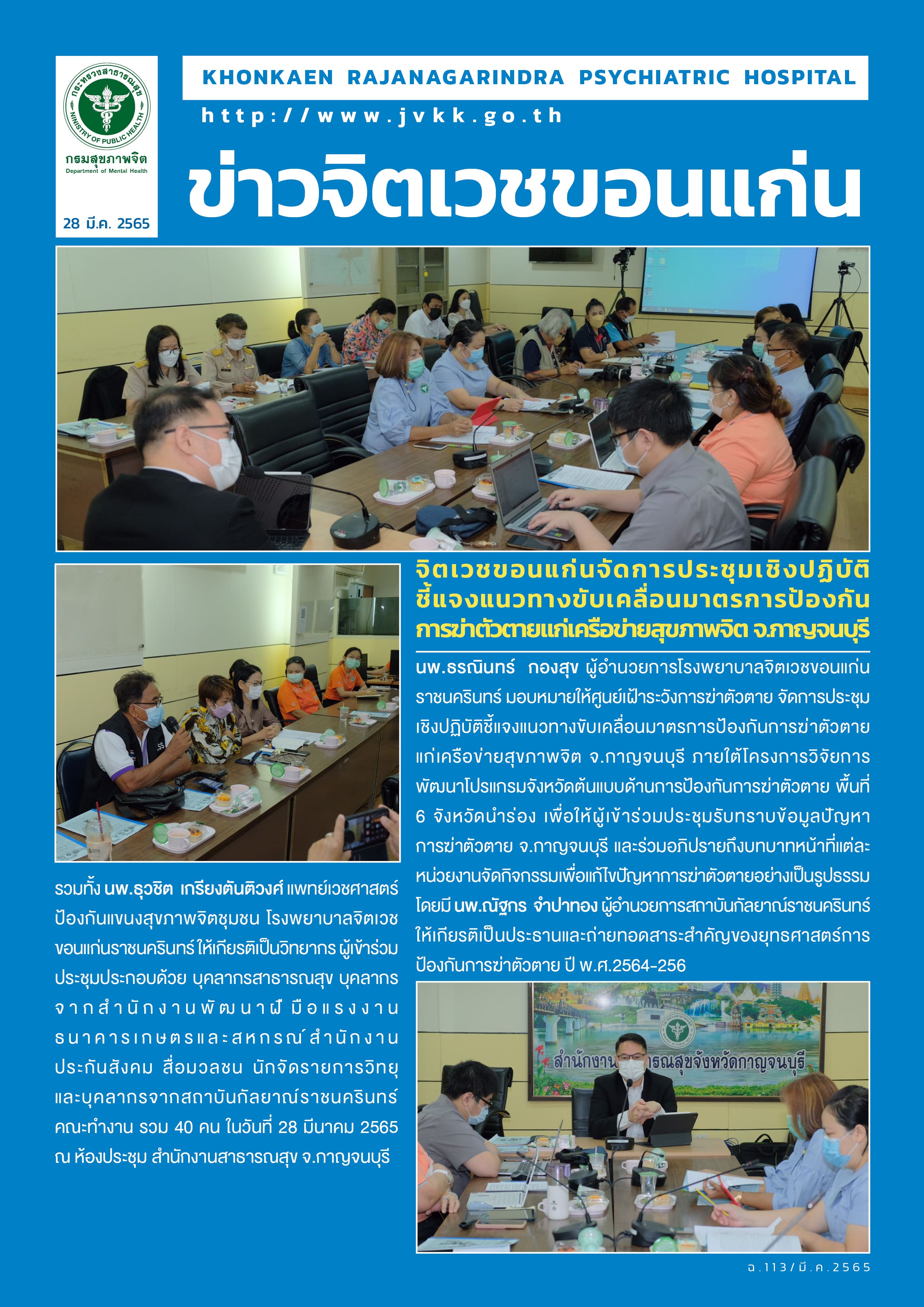 ประชุมเชิงปฏิบัติชี้แจงแนวทางขับเคลื่อนมาตรการป้องกันการฆ่าตัวตายแก่เครือข่ายสุขภาพจิต จ.กาญจนบุรี วันที่ 28 มีนาคม 2565 photos and movies